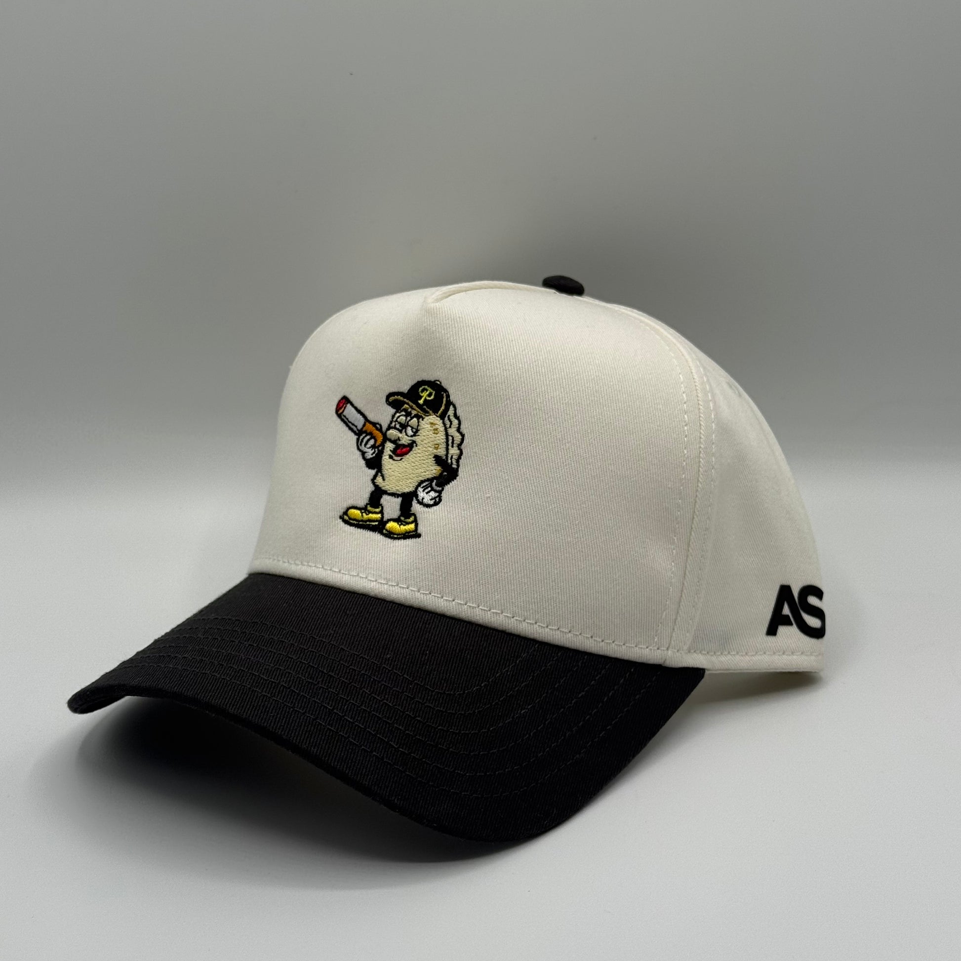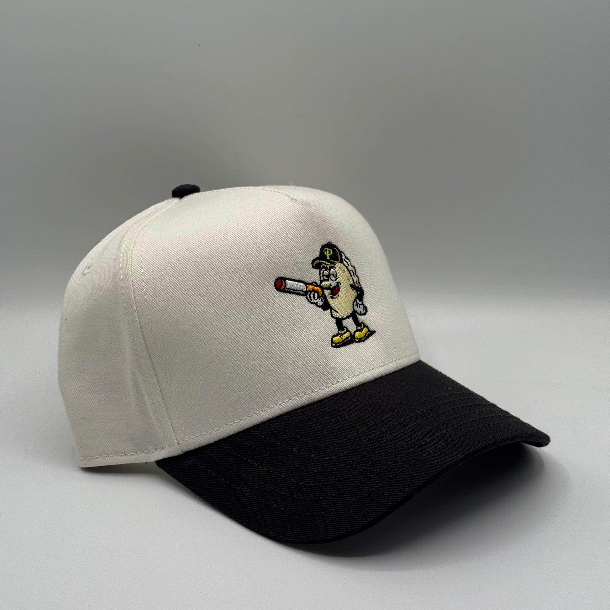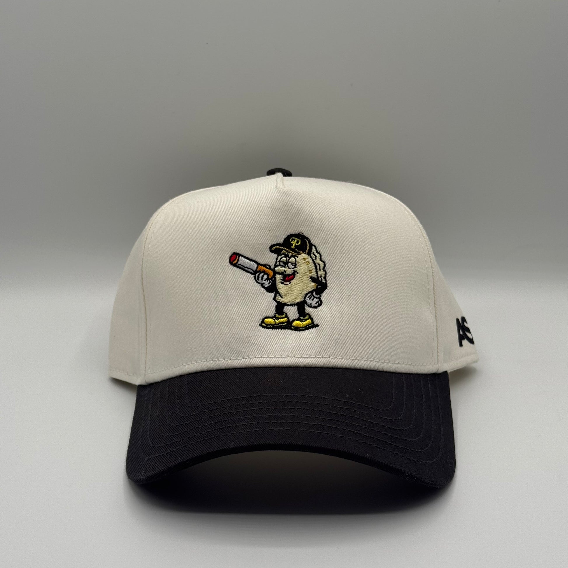 5-Panel High Profile Baseball Cap. Custom embroidered in-house in the heart of downtown Pittsburgh. Material: 100% cotton blend for comfort and durability. Design: Structured with a firm front panel and seamless front panel with full buckram. Ventilation: 4 sewn eyelets for breathability. Visor: Matching color with 6 rows of stitching and a matching fabric under visor. Fit: Adjustable plastic snap closure for a custom fit.
