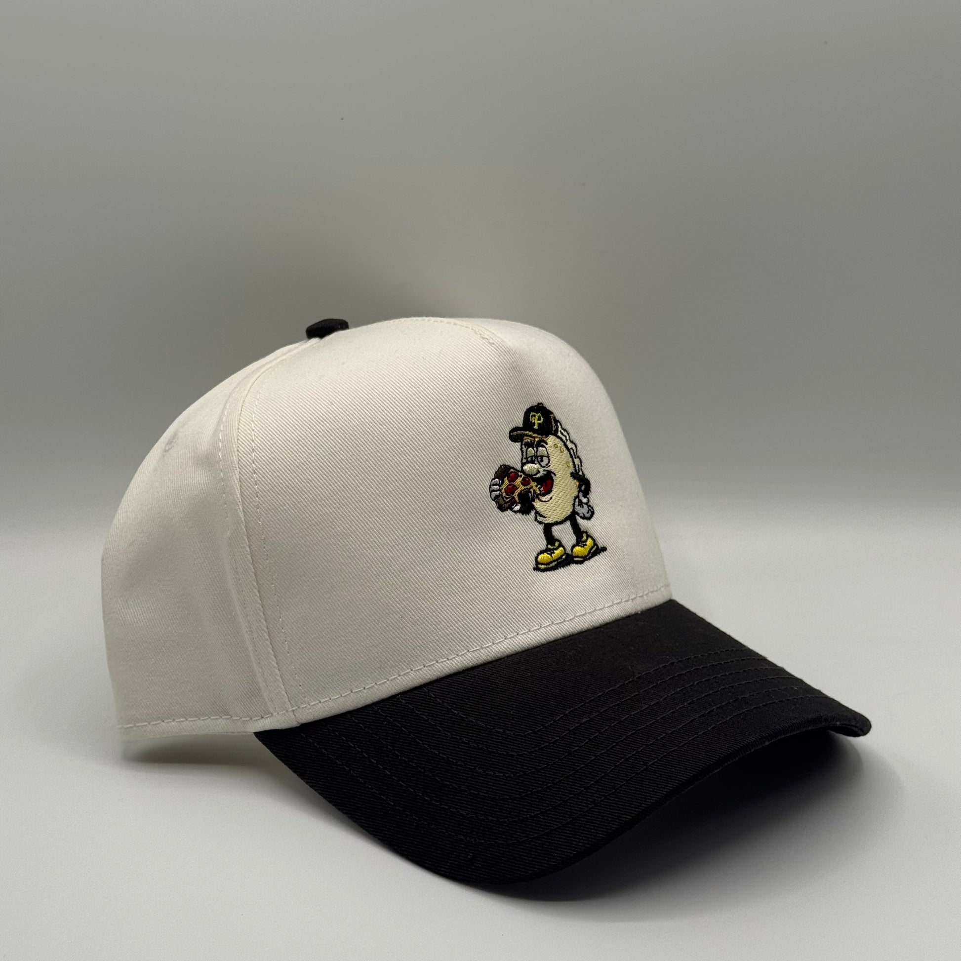 5-Panel High Profile Baseball Cap. Custom embroidered in-house in the heart of downtown Pittsburgh. Material: 100% cotton blend for comfort and durability. Design: Structured with a firm front panel and seamless front panel with full buckram. Ventilation: 4 sewn eyelets for breathability. Visor: Matching color with 6 rows of stitching and a matching fabric under visor. Fit: Adjustable plastic snap closure for a custom fit.