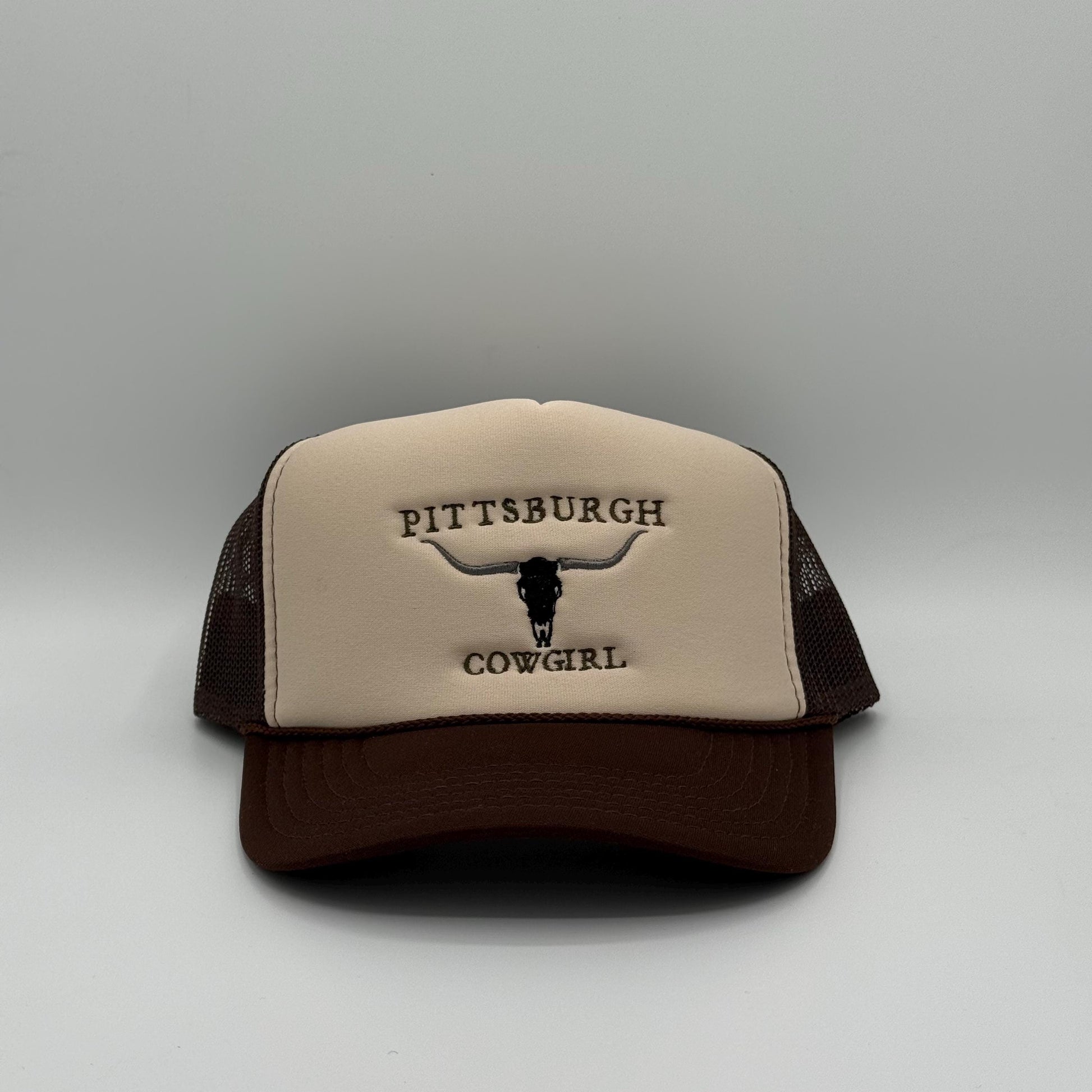 Pittsburgh Cowgirl hat. Custom made in-house in the heart of downtown Pittsburgh. Foam trucker hat.